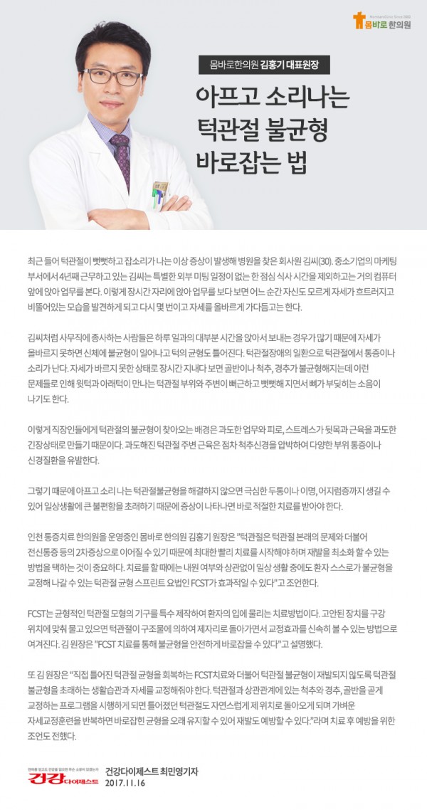 아프고 소리나는 턱관절 불균형 바로잡는 법 페이지 정보 작성자 관리자 작성일17-11-30 18:42 조회2,395회 댓글0건 관련링크 http://"http://www.ikunkang.com/news/articleView.html?idxno=22259 2924회 연결 이전글 다음글 목록 본문 이전글 다음글 목록