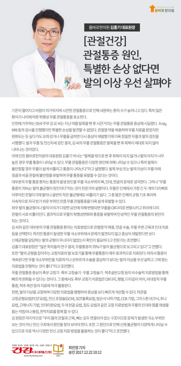 [관절건강] 관절통증 원인, 특별한 손상 없다면 발의 이상 우선 살펴야 페이지 정보 작성자 관리자 작성일18-01-02 12:42 조회2,382회 댓글0건 관련링크 http://www.ikunkang.com/news/articleView.html?idxno=22441 2400회 연결 이전글 다음글 목록 본문 이전글 다음글 목록