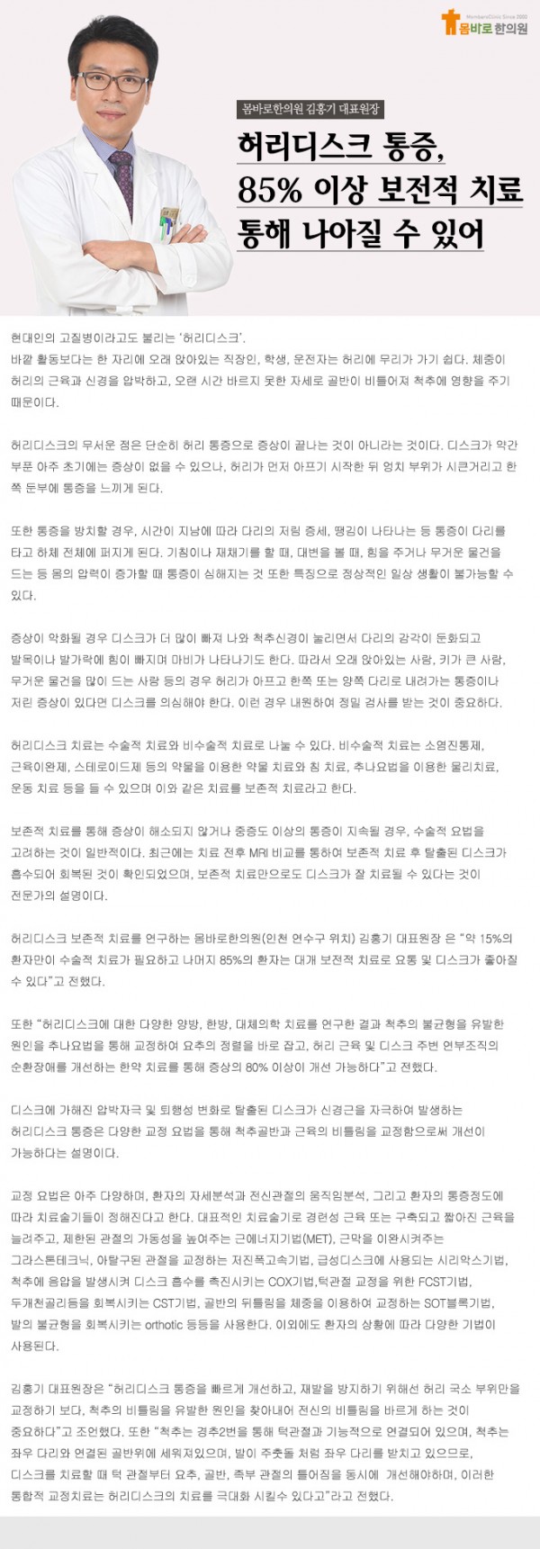 허리디스크 통증, 85% 이상 보전적 치료 통해 나아질 수 있어 페이지 정보 작성자 관리자 작성일17-11-02 17:56 조회2,267회 댓글0건 관련링크 http://www.medical-tribune.co.kr/news/articleView.html?idxno=74598 1735회 연결 이전글 다음글 목록 본문 이전글 다음글 목록