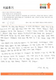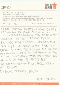 (김**님의 자필 후기를 그대로 옮겼습니다.) 왼쪽다리가 아파서 원장님께 교정치료 중 냄새를 못 맡은지 10년쯤 됐다고 말씀드렸더니 감기 후유증으로나 아님 다른 원인이 있냐고 물으셔서 직장이 음식 만드는 곳이라 여러가지 냄새를 복합적으로 맡아서 그런것 같다고 말씀드렸더니..&...