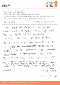 (박**님의 자필 후기를 그대로 옮겼습니다.) 2개월 전 쇼파에서 낮잠을 자다 턱이 갑자기 벌어지지 않아 몸바로 한의원에서 턱관절 치료를 받았다. 치료 후 턱관절에 있는 디스크가 제자리로 돌아왔으며, 음식을 섭취하거나 하품을 하거나 턱을 이용하는게 불편함이 많이 개선되었다.&...
