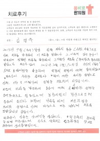 (조**님의 자필 후기를 그대로 옮겼습니다.) 현재 나이 38세 입니다. 10대 학창시절부터 고개를 숙이면 뒷목 및 어깨결림으로 고생하다가, 증상이 점점 악화되어 30대에 들어서는 눈 및 코 뒤의 압박감까지 더해져서 늘 불편한 상태로 생활했었고, 심한 경우 1년에 한두번 정도는 아무것도 하지...