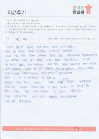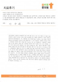 (김**님의 자필 후기를 그대로 옮겼습니다.)어깨통증이 너무나 심해서 병원을 처음 찾았습니다. 양방 병원을 수술 같은 거 하라고 할까 봐 일부러 한의원을 찾았는데,어께 뿐 만아니라 소화불량 및 일상 생활에 불편하던 모든 곳을 치료하게 되었네요.초진부터 꼼꼼히 문진표를 작성하여 진료를 봐주시는 ...