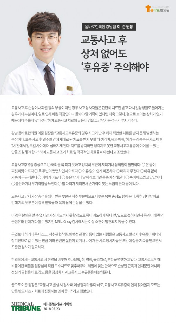 교통사고 후 상처 없어도 '후유증' 주의해야 페이지 정보 작성자 관리자 작성일18-04-23 17:54 조회2,718회 댓글0건 관련링크 http://www.medical-tribune.co.kr/news/articleView.html?idxno=78111 2073회 연결 이전글 다음글 목록 본문 이전글 다음글 목록