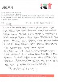 (***님의 자필 후기를 그대로 옮겼습니다.)2010년 8월 교통사고로 인해 00정형외과 3주 입원 치료받고 퇴원함.퇴원 후 어깨 결림, 손 저림 등 후유증 통증으로(머리아픔) 우울증까지 함께 와서 고통 중미래여성한의원 내원하여 침 치료, 물리치료, 교정, 한약복용하여 지금은 완치되...