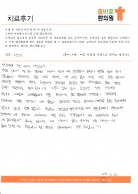 (홍**님의 자필 후기를 그대로 옮겼습니다.) 허리디크로 인해 다리방사통이 생겨서 지인의 소개로 몸바로한의원에 내원했어요. 4주간 한약을 복용하면서 일주일에 두세번의 수기로 통증치료를 받았는데 2~3주 지나면서 증상이 호전되기 시작하여 2달정도 꾸준히 치료를 받으니 증상이 거의 없어졌어...